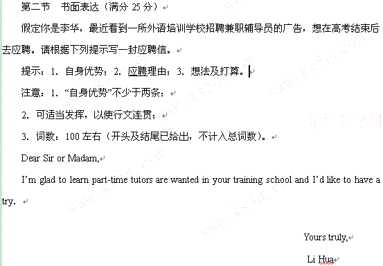 第二节 书面表达(满分25分) 假定你是李华,最近看到一所外语培训学校招聘兼职英语夏令营辅导员的广告,想在高考结束后去应聘。请根据下列提示用英语写一封应聘信。 ●自身优势 英语听说能力强 有组织管理经历 ●应聘理由 利用假期参加社会实践 提高英语应用能力 ●想法打算 注意:1. 写作中不能涉及考个人真实信息; 2. 可适当发挥,以使行文连贯; 3. 词数:100左右(开头及结尾已给出,不计入总词数)。 Dear Sir or Madam, I’m glad to learn part-time tutors are wanted in your training school for the coming summer camp and I’d like to have a try. I’m looking forward to your reply. Yours truly, Li Hua |