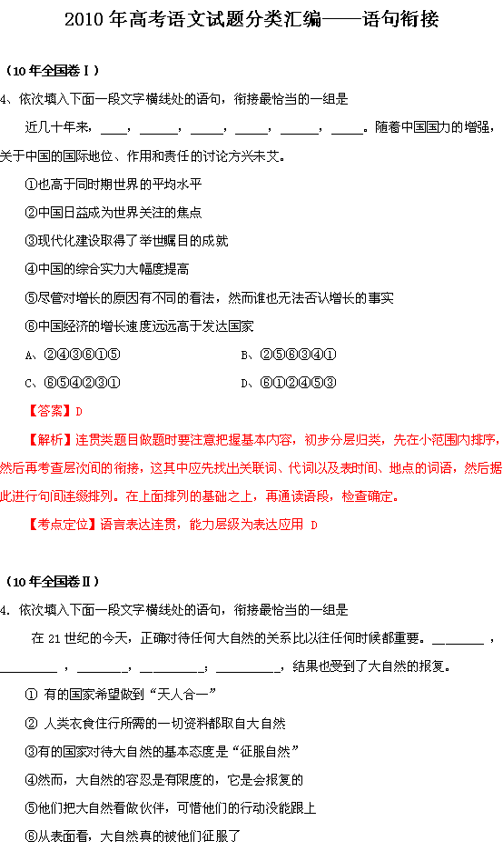 2010高考语文试题分类汇编——语句衔接