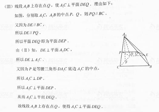 (I)求证:DE∥平面A1CB; (II)求证:A1F⊥BE; (III)线段A1B上是否存在点Q,使A1C⊥平面DEQ?说明理由。