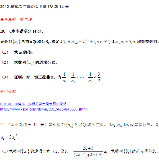 喜讯:2012年高考广东卷命中第19题14分(数学理)