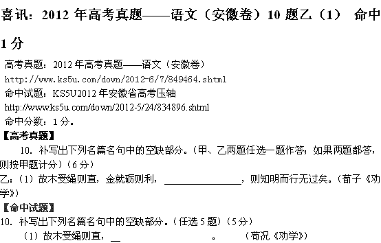 喜讯:2012年高考真题——语文(安徽卷)10题乙(1) 命中1分