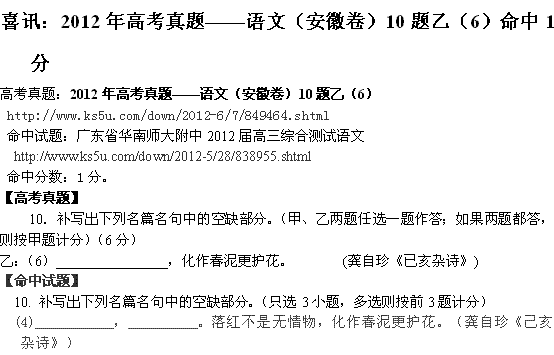 喜讯:2012年高考真题——语文(安徽卷)10题乙(6)命中1分