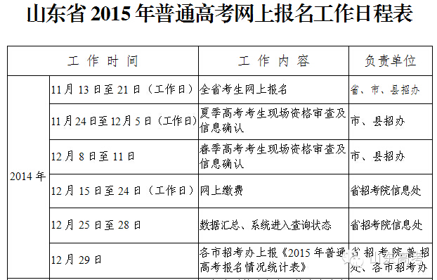 2015年高考报名工作将从今天启动,昨天,省招考院下发《关于做好山东省2015年普通高等学校招生报名工作的通知》,春季高考知识考试安排在2015年5月9日至10日,夏季高考则执行全国统一时间6月7日、8日,春季高考和夏季高考的报名、考试与录取工作分开进行,允许考生相互兼报。