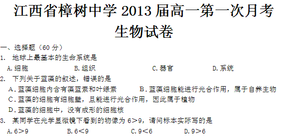 百度:江西省樟树中学2010-2011高一第一次月考(生物)