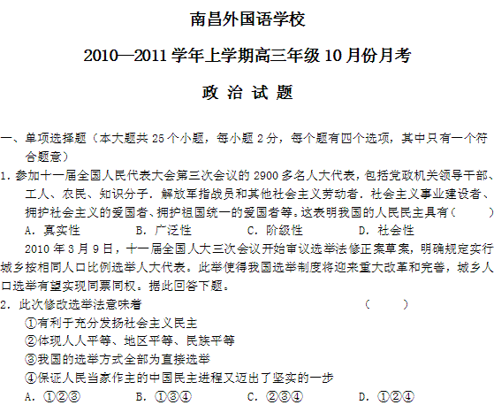 百度:江西省南昌外国语学校2010-2011学年高三上学期10月月考(政治)