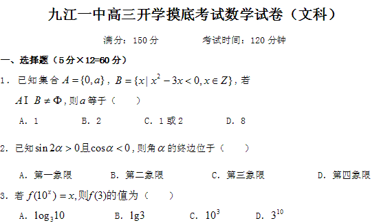 百度:江西省九江一中2011届高三开学摸底考试(数学文)