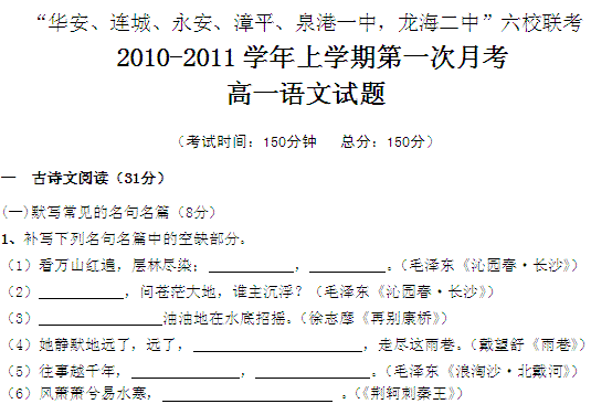 福建省四地六校联考2010-2011学年高一第一次月考 语文