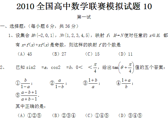 百度:2010全国高中数学联赛模拟试题(十)