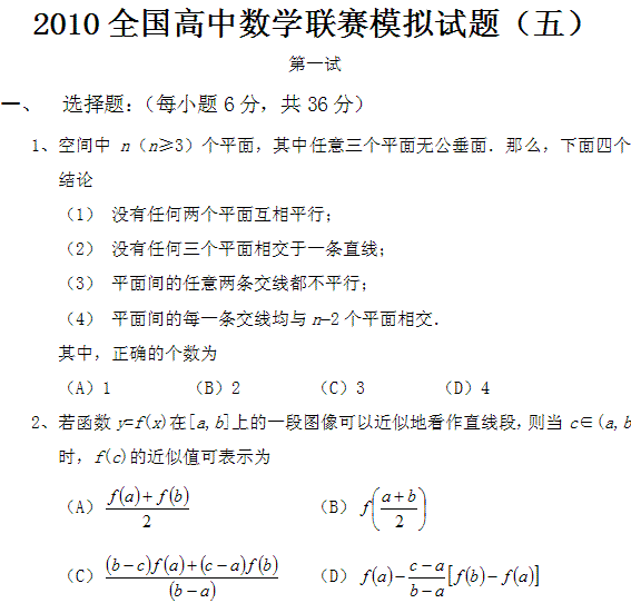 谷歌:2010全国高中数学联赛模拟试题(五)