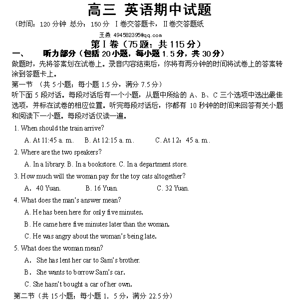 谷歌:黑龙江省双鸭山一中2011届高三上学期期中考试(英语)(附带听力MP3)