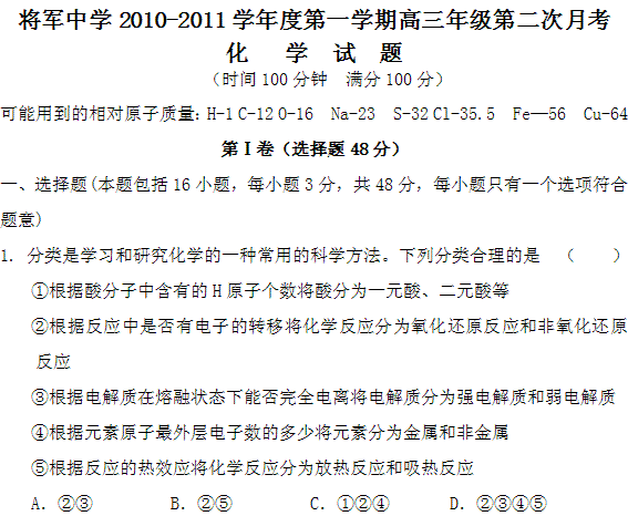 谷歌:江西省兴国县将军中学2011届高三第二次月考(化学)缺答案