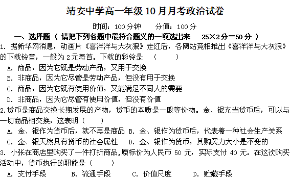 百度:江西省靖安中学2010-2011学年高一上学期10月月考(政治)