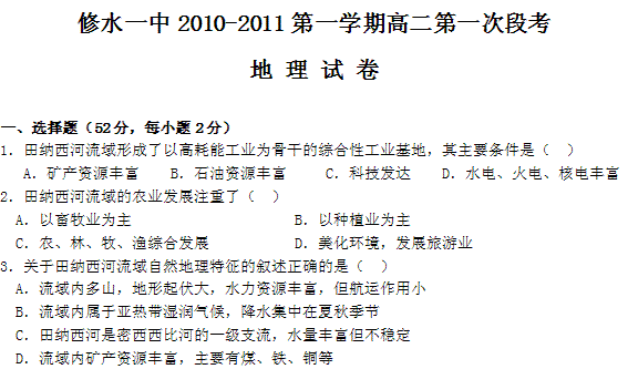 百度:江西省九江市修水一中2010-2011学年高二第一次段考(地理)