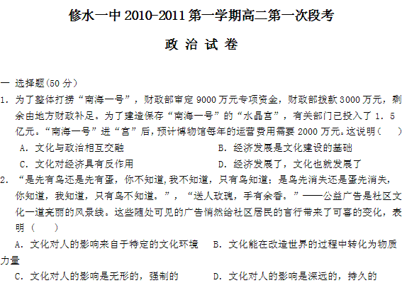 百度:江西省九江市修水一中2010-2011学年高二第一次段考(政治)