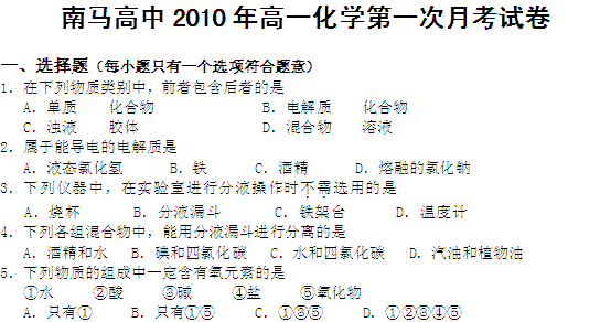 百度:浙江省南马高级中学10-11学年高一9月月考 化学(缺答案).doc