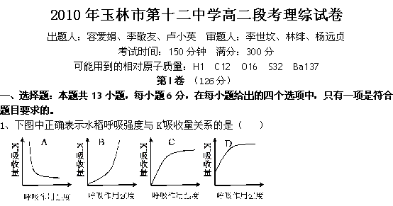 百度:广西玉林市第十二中学10-11学年高二段考 理综