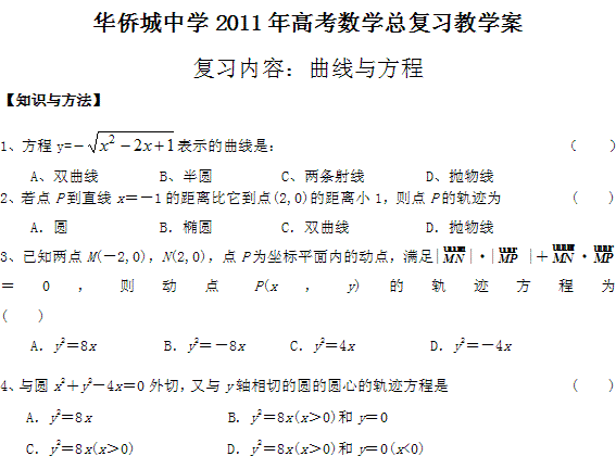 谷歌:广东省华侨城中学2011年高考数学总复习教学案(曲线与方程)