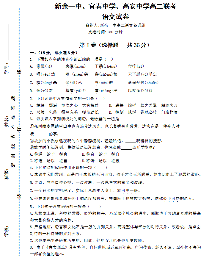 江西省新余一中 宜春中学 高安中学10-11学年高二上学期第三次段考江西省新余一中 宜春中学 高安中学10-11学年高二上学期第三次段考江西省新余一中 宜春中学 高安中学10-11学年高二上学期第三次段考江西省新余一中 宜春中学 高安中学10-11学年高二上学期第三次段考语文 试题 答案江西省新余一中 宜春中学 高安中学10-11学年高二上学期第三次段考(语文)