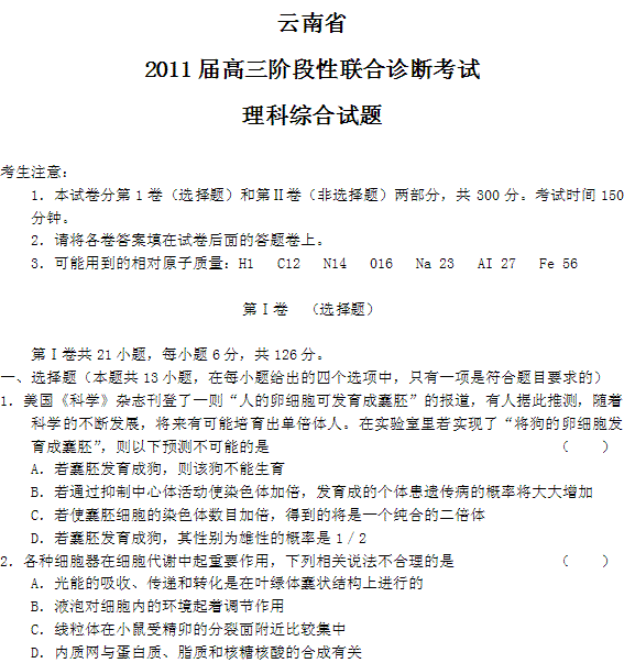 有道:云南省2011届高三阶段性联合诊断考试(理综)