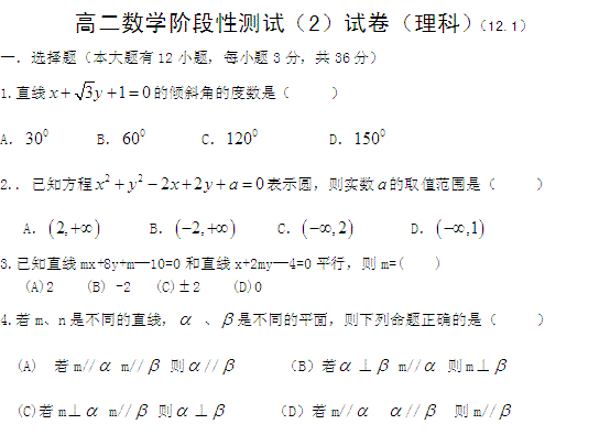 百度:浙江省海宁一中10-11学年高二上学期第二次阶段性测试题 数学理(缺答案)