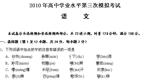 有道:2010湖南省长沙市一中高二第三次学业水平模拟考试(语文)