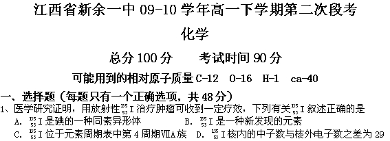 谷歌:2010年江西省新余一中高一下学期第二次段考(化学)