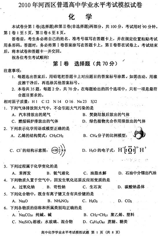 谷歌:2010年天津市河西区普通高中学业水平模拟测试(化学)