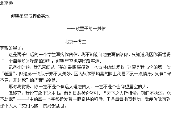 有道:2010高考全国各地满分作文及点评:北京《仰望星空与脚踏实地》