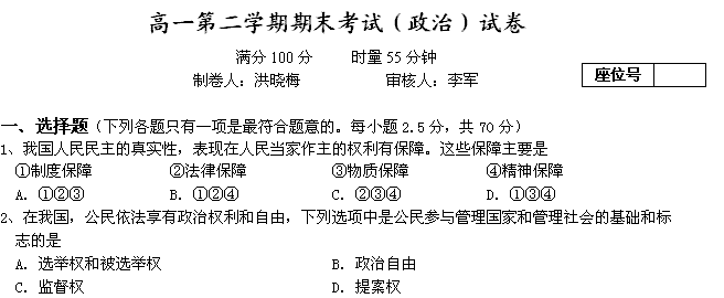 湖南省长沙市一中2010年上学期高一期末考试(政治).湖南名校期末考试试题由高考资源网独家提供,试题实用性强内容编辑一流,欢迎使用!