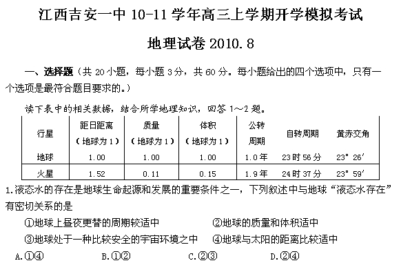 谷歌:2011届江西省吉安一中高三上学期开学模拟(地理)