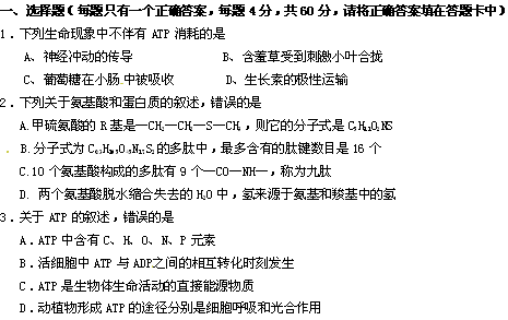 百度:云南省文澜高级中学2011届高三期初摸底测试(生物)缺答案