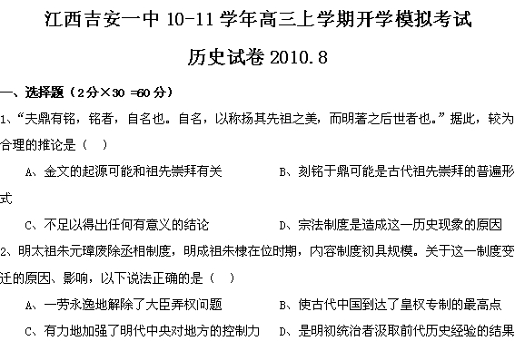 百度:2011届江西省吉安一中高三上学期开学模拟(历史)