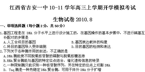 2011吉安一中高三开学模拟生物