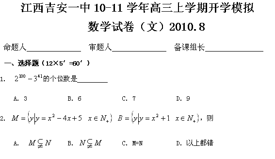 有道:2011届江西省吉安一中高三上学期开学模拟(数学文)