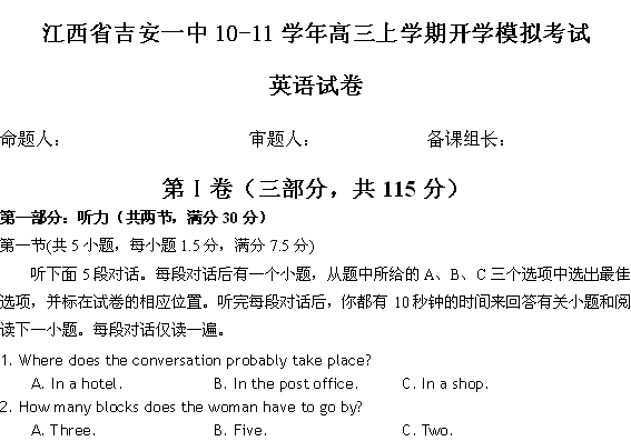 百度:2011届江西省吉安一中高三上学期开学模拟(英语)