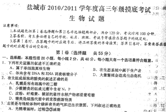 谷歌:江苏省盐城市2011届高三摸底考试(生物)(扫描版无答案)