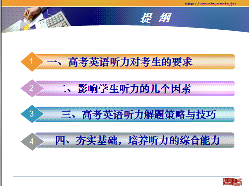 百度:福建省第二届新课程高三毕业班英语教学工作会议课件:高考听力解题策略与技巧