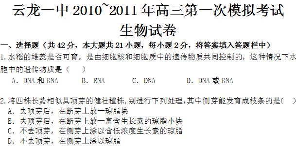百度:云南省大理云龙县第一中学2011届高三第一次模拟考试(生物)缺答案