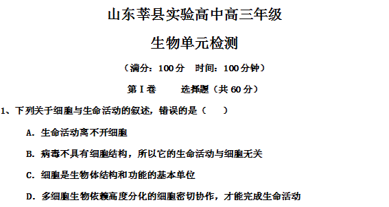百度:山东省莘县实验高中2012届高三9月月考 生物试题