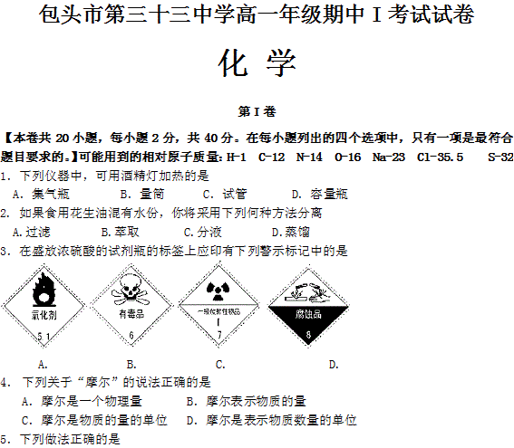 百度:内蒙古包头三十三中11-12学年高一上学期期中考试I 化学试题