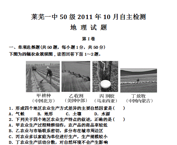 百度:山东省莱芜一中2012届高三10月阶段测试 地理试题