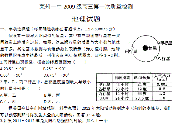 百度:【KS5U首发】山东省莱州一中2012届高三第一次质量检测 地理试题