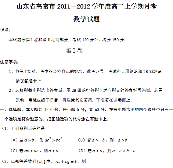 百度:山东省高密市11-12学年高二上学期10月月考试题(数学理)