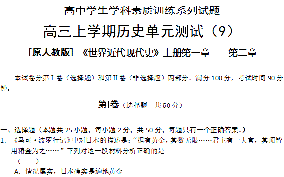 谷歌:2011-2012学年大纲版高三上学期单元测试(9)(历史)