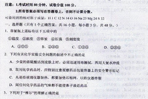 百度:河南省开封高中11-12学年高一第一次月考(化学)扫描版