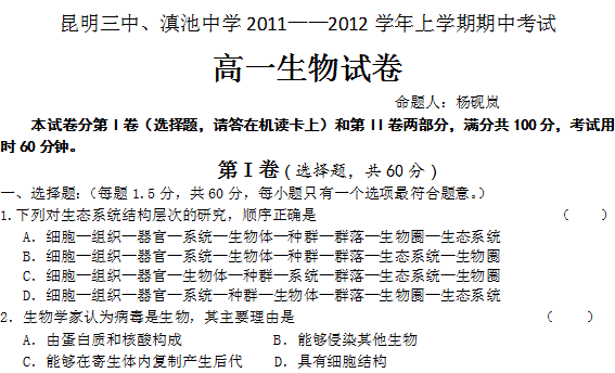 百度:云南省昆明三中、滇池中学11-12学年高一上学期期中考试 生物试题1