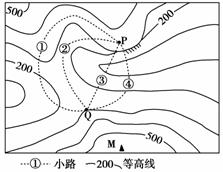 [解析] 从图中可以看出,p、q两点之间的四条小路中,②线穿越的等高线最少,地形起伏最小。