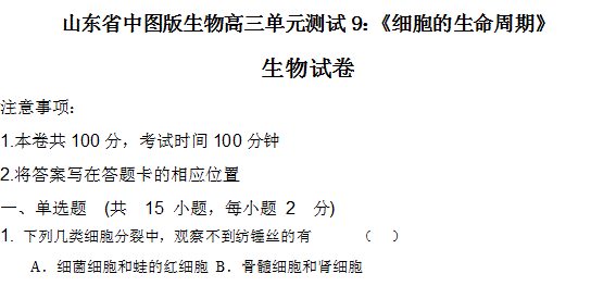 百度:山东省中图版生物2012届高三单元测试9:《细胞的生命周期》(必修1)