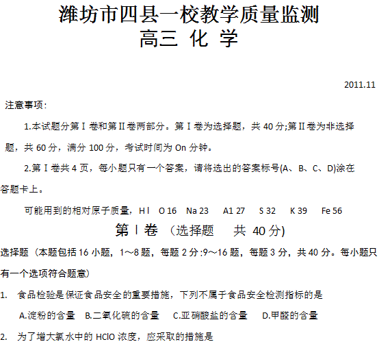 谷歌:【KS5U首发】山东省潍坊市2012届高三上学期期中四县一校教学质量监测 化学试题(含答案)