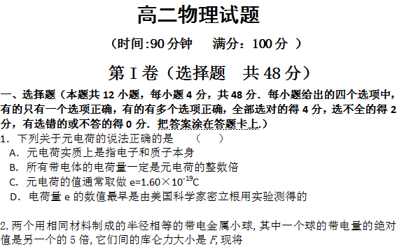 有道:【KS5U首发】山东省兖州市11-12学年高二上学期期中考试 物理试题